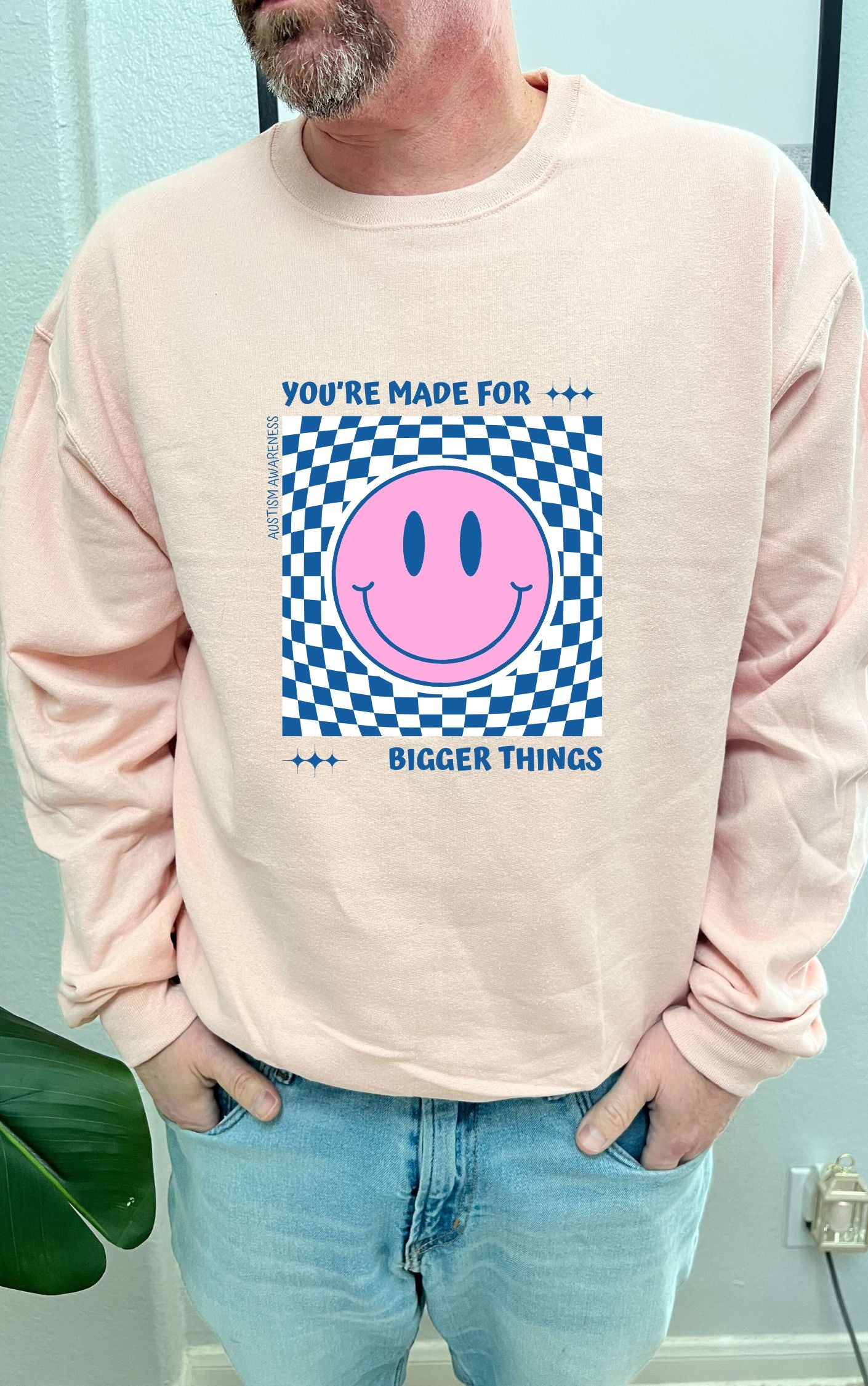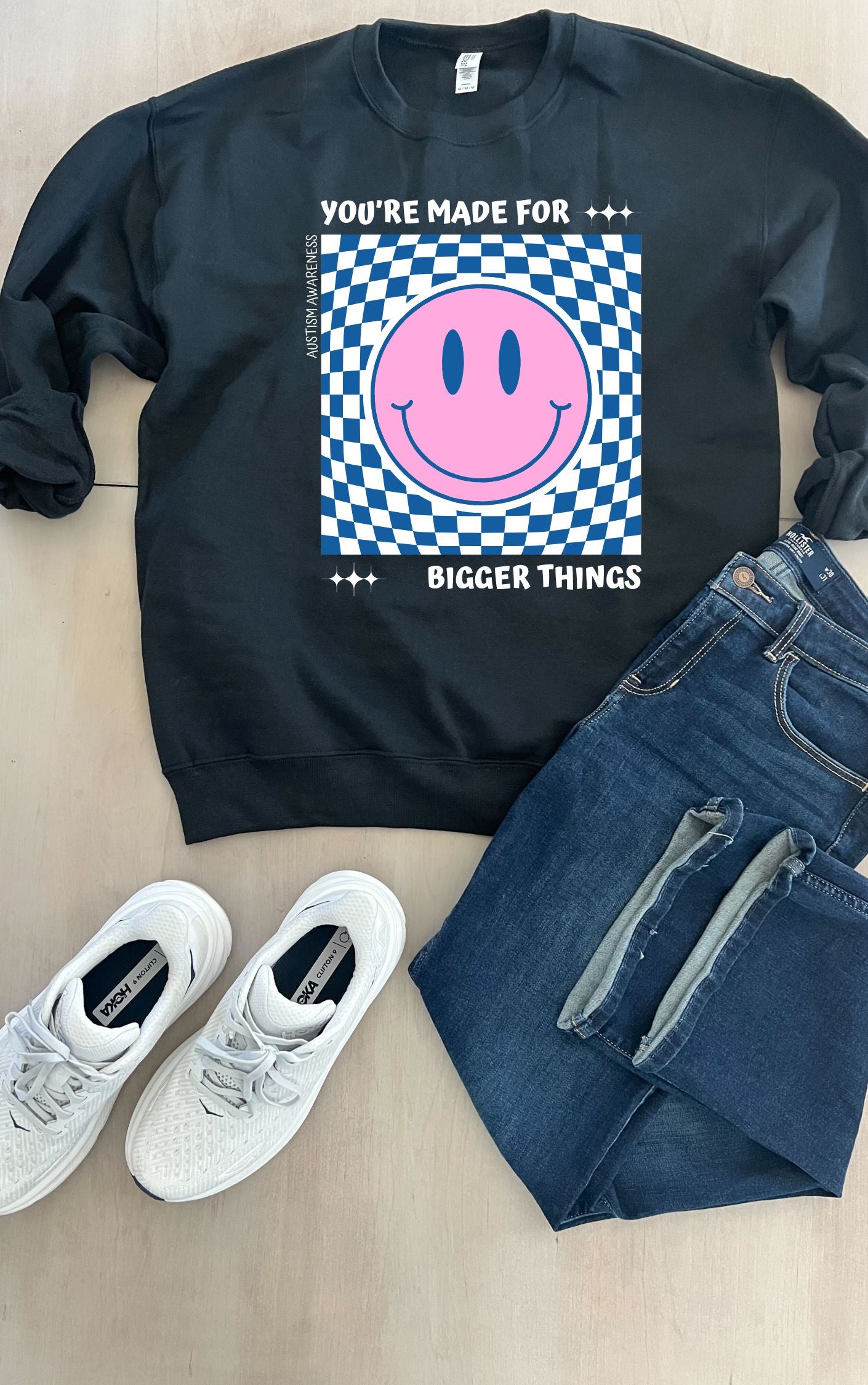 A reminder you can wear—because you are destined for greatness! Our "You're Made for Bigger Things" sweater is designed to uplift, inspire, and keep you cozy all at once. Featuring a bold, positive message paired with a playful smiley face graphic, this sweater radiates confidence and encouragement wherever you go.